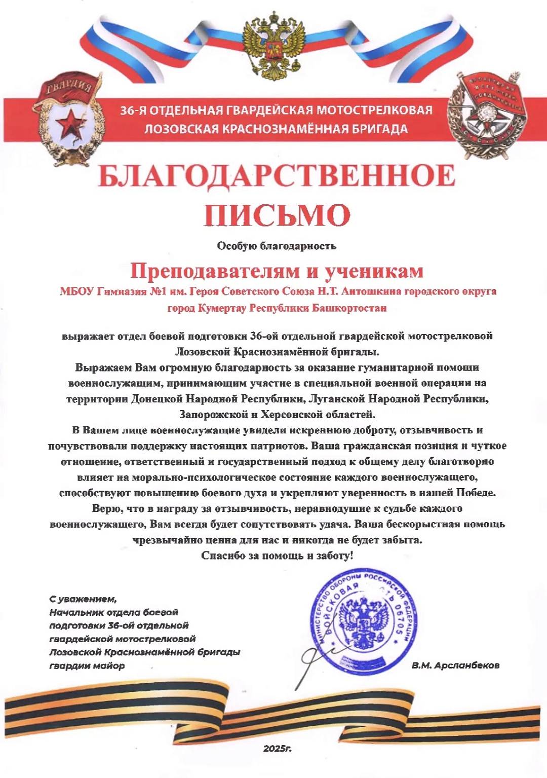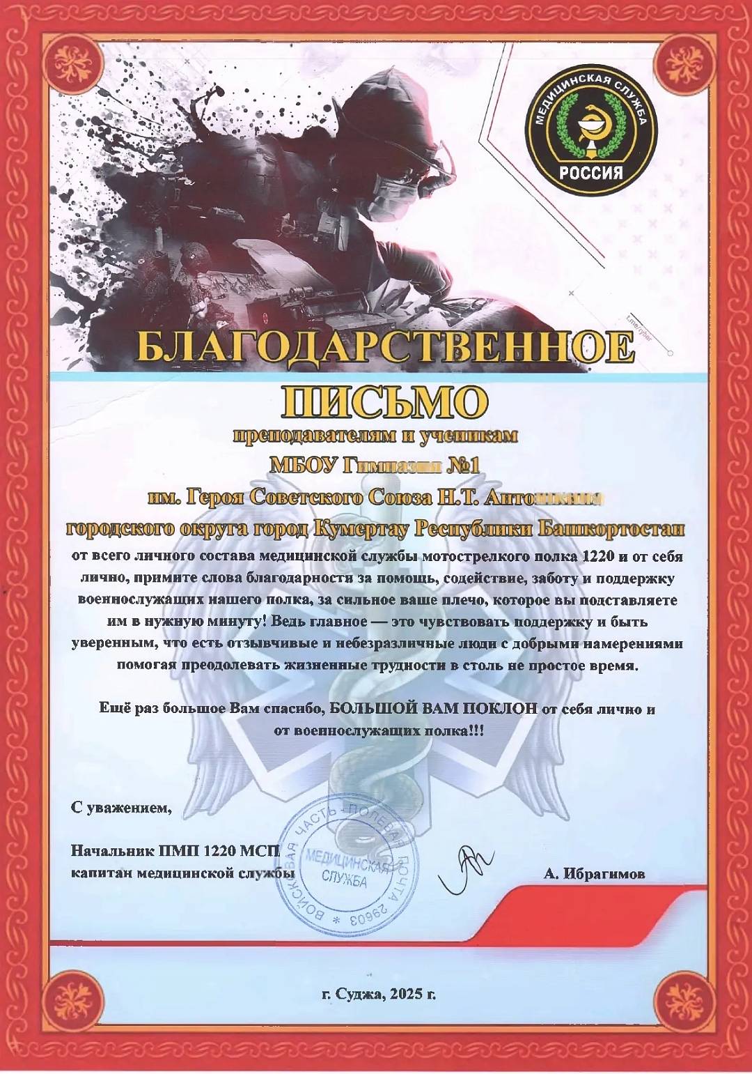 Педагоги , учащиеся и родители МБОУ Гимназии №1 им. Н.Т. Антошкин с гордостью поддерживаем наших защитников и выражаем благодарность за их мужество и самоотверженность. Каждый из нас понимает, насколько важна гуманитарная помощь в это непростое время.